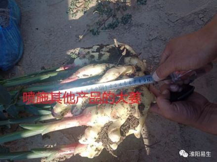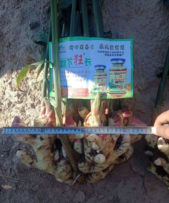 我們的市場人員現(xiàn)場挖姜,將噴施地下狂長的大姜與噴施其他產(chǎn)品的大姜現(xiàn)場測量對比,噴施過地下狂長的大姜姜指頭粗胖、連接點(diǎn)粗,不易破盤,姜盤齊整,并且比噴施其他產(chǎn)品的大姜長10cm,高5cm,對比非常明顯。