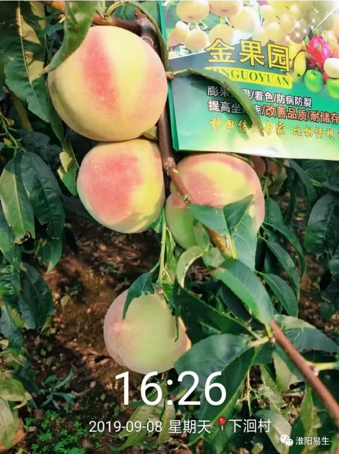 2019年易生科技售后服務(wù)組來到山東平度市店子鎮(zhèn)進行噴施金果園的效果回訪,可以看到噴施過金果園的毛桃個頭大且均勻,顏色鮮亮,上色均勻,每個毛桃直徑都在80-90mm以上。未噴施金果園的毛桃個頭小,且果皮表面有一層灰白色的物質(zhì),霧蒙蒙的感覺不鮮亮。