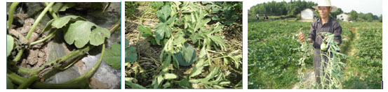 病株被病菌浸染候,在氣候正常情況下,一般能正常生長(zhǎng)20—30天,能正常開花結(jié)瓜,干旱無雨,氣溫在30度以上基本能正常生長(zhǎng),雨后氣溫下降至28度以下,天晴突然死亡,所以瓜農(nóng)俗稱抽秧死。