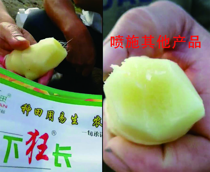 看這對比圖就知道,地下狂長效果有多好。現(xiàn)場直接拔出大姜,沖洗,切姜。為了公平起見,我們工作人員對比了姜的側(cè)芽,明顯看出,噴施過地下狂長的大姜干物質(zhì)多,不僅姜絲長,粗,多,而且顏色也金黃光亮